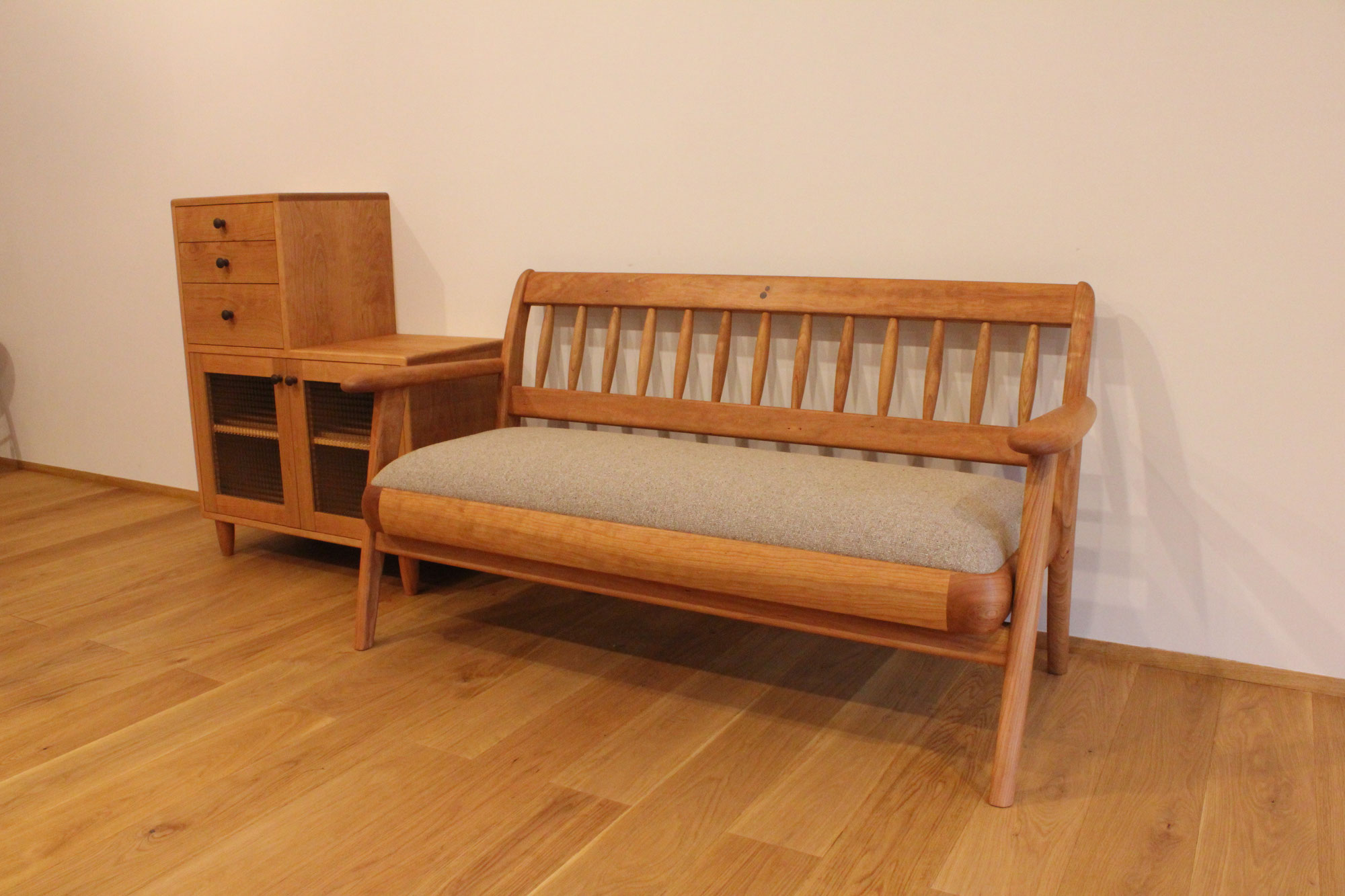 横浜市のM様からオーダーいただいたソファベンチと階段サイドボードです。2人掛けの小さめのソファですね。